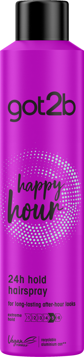 got2b Happy Hour 24 h Hold -hiuskiinne pitää kampauksen upeana kellon ympäri! Tanssi vaikka yön pikkutunneille saakka - tämä lakka kestää läpi yön. Happy Hour 24 h Hold -hiuslakka suojaa hiuksiasi myös kuivumiselta ja kosteudelta. Vegaaninen koostumus. Suihkuta hiuksiin tasaisesti noin 30 cm etäisyydeltä.