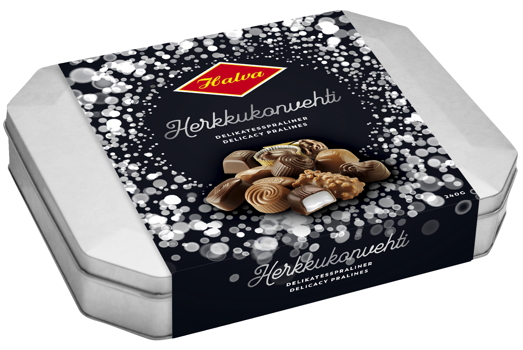 Tyylikäs uuden ulkoasun saanut peltirasia sisältää herkullisia täytesuklaakonvehteja, mukana jouluisia makuja. Kiva lahjaidea!