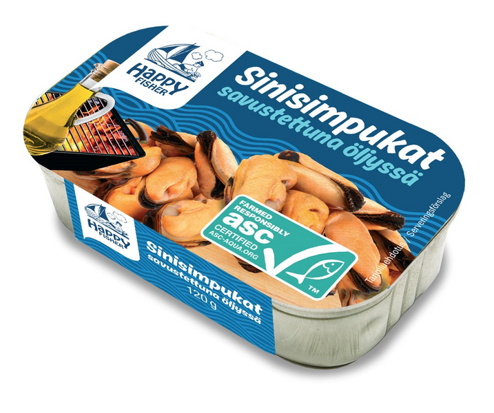 Happy Fisher Sinisimpukat savustettuina öljyssä 120g/72g ASC