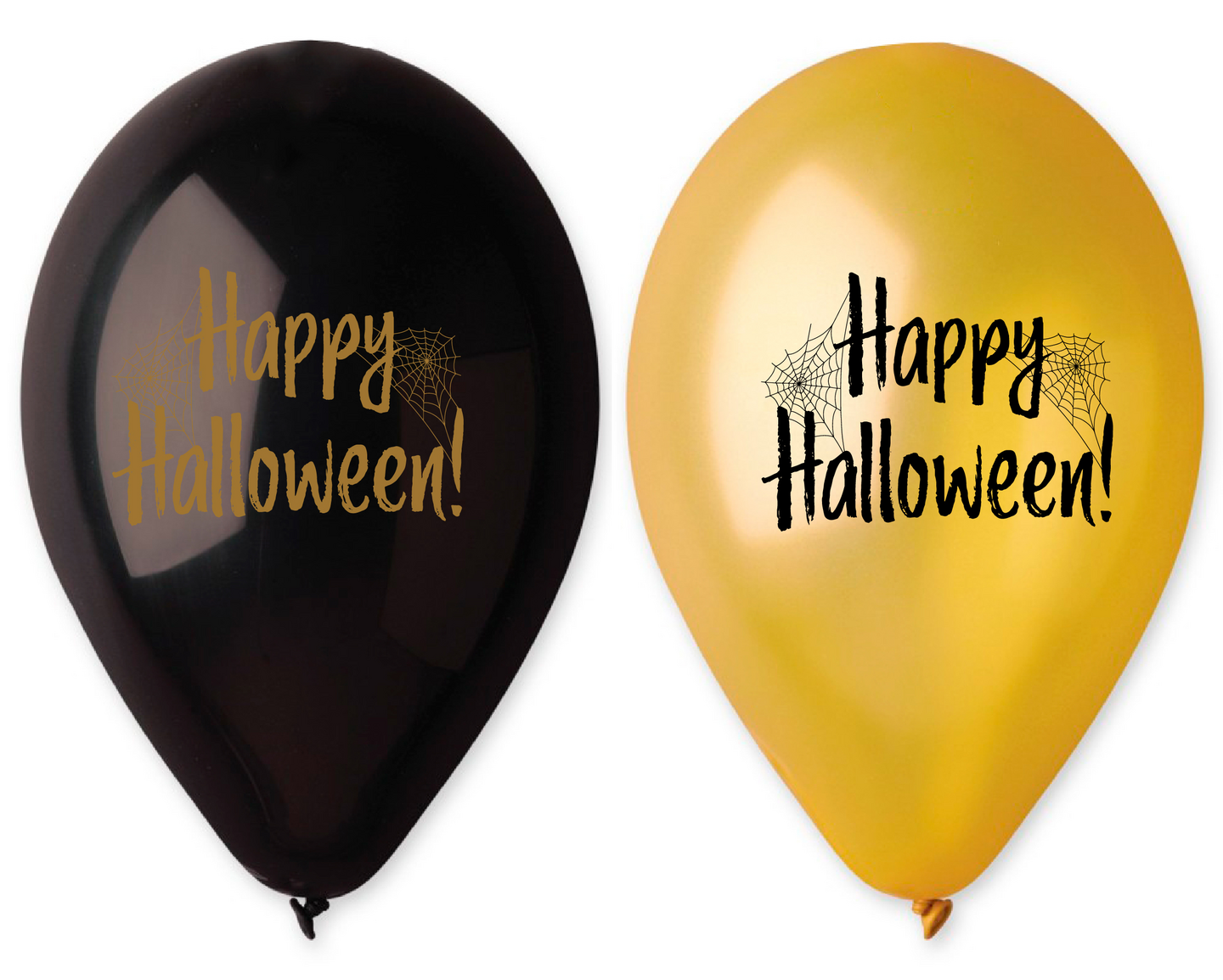 Happy Halloween ilmapallot Halloween juhlien koristeeksi! Pussissa kullanvärisiä ja mustia ilmapalloja, yhteensä 5 kappaletta. Täytä ilmapallot heliumilla tai ilmalla ilmapallopumpulla. Ilmapallojen koko täytettynä noin 30 cm. Valmistettu luonnonkumista (lateksi).