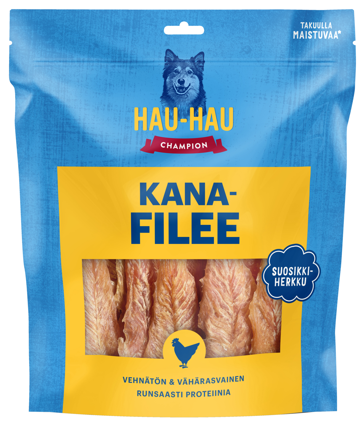 - Vehnätön ja vähärasvainen - Runsaasti proteiinia - Klassikkoherkku - Valmistusmaa: Kiina Herkullinen Hau-Hau Champion Kanafilee on hemmottelua joka puraisulla. Aidosta kananrinnasta valmistettu makupala on runsaasti proteiinia sisältävä mehevä herkku. Luontaisesti vähärasvainen kanafilee sopii myös helposti lihoville koirille. Kanafileet sopivat niin koirakaverin herkutteluhetkiin kuin mukaan harrastuksiinkin. Vähärasvaiset koiran makupalat eivät sisällä lisättyä sokeria tai vehnää. Kanafileet ovat kuivattua lihaa, joten pidäthän huolen, että koirallasi on aina raikasta vettä saatavilla. Herkut sisältävät runsaasti proteiinia, joten tarjoa niitä koiralle kohtuudella. Jos etsit kotimaista kanaherkkua koirallesi, kokeile vaihtoehtoisesti Ikaalisissa valmistettua Hau-Haun kuivattua kanan siipiherkkua. Hau-Haun runsaasta herkkuvalikoimasta löydät taatusti koirasi suosikin!