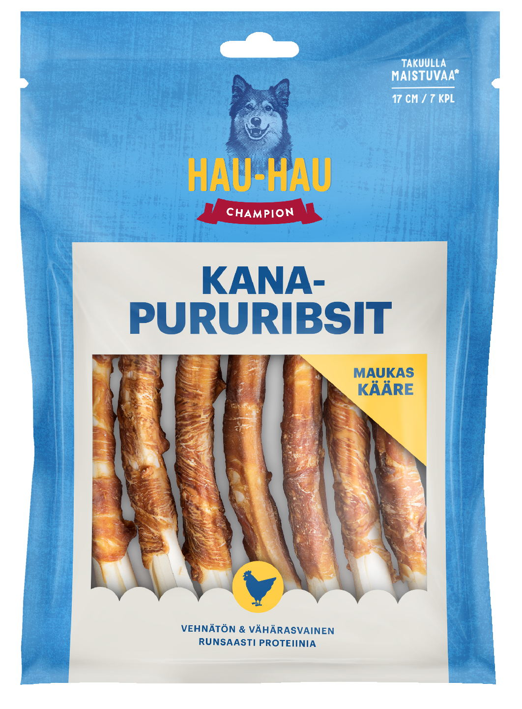 Hau-Hau Championin Kanapururibsit tarjoavat koirallesi hampaita hoitavaa ja mieluista puuhaa. Makoisa kanakääre tekee näistä puruluista erityisen maistuvia koiralle. Ribseistä on myös helppo pitää kiinni niiden kaarevan muodon ansiosta. Maistuvat kanapururibsit ovat vehnättömiä ja vähärasvaisia, ja ne sisältävät runsaasti proteiinia. Säännöllinen puruluiden syöminen edistää koiran hampaiden hyvinvointia.