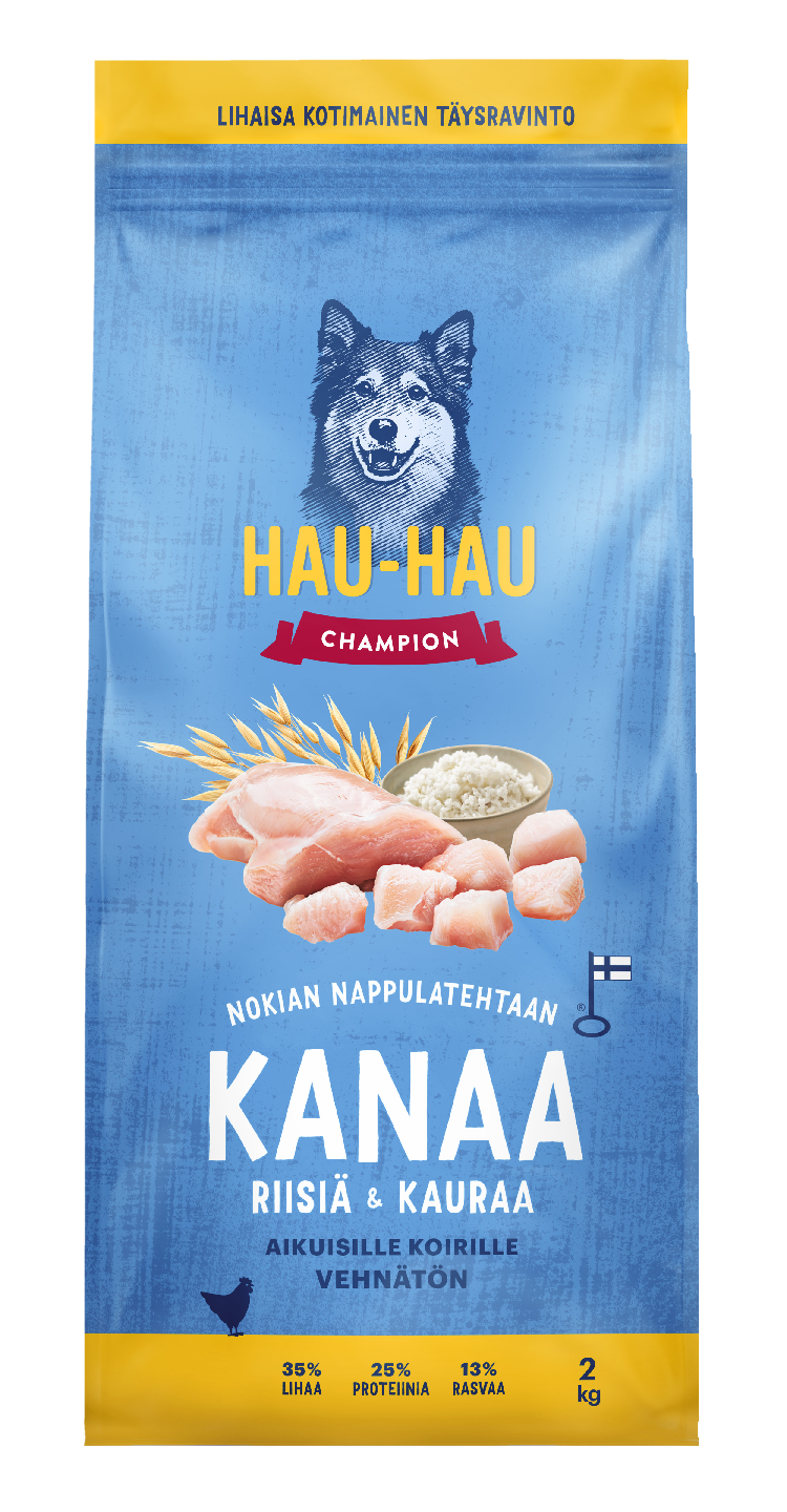 Hau-Hau Champion Nokian nappulatehtaan Kana-riisi-kaura täysravinto aikuisille koirille 2 kg PPA