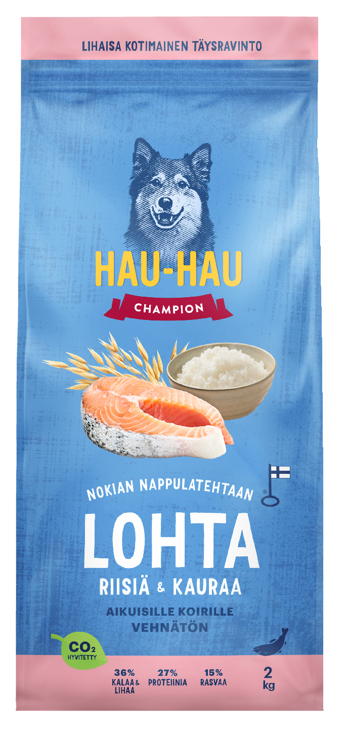 Hau-Hau Champion Lohta, riisiä & kauraa on kotimainen koiran kuivaruoka. Herkullinen koiran täysravinto sisältää 26 % lohta, jota täydentää 10 % maistuvaa kotimaista kanaa. Tämä vehnätön koiran kuivaruoka on valmistettu Hau-Haun omalla Nokian nappulatehtaalla Pirkanmaalla.