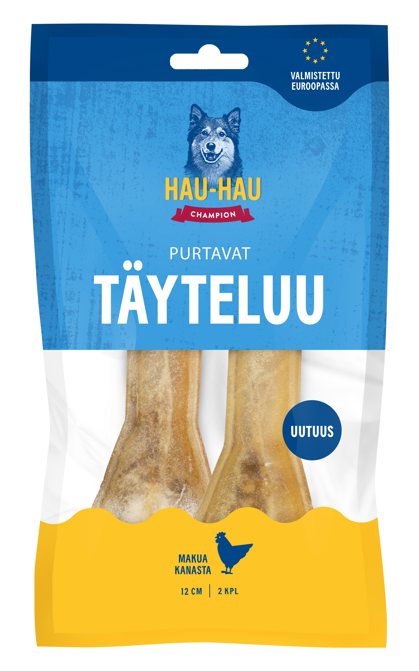 Hau-Hau Champion Purtavat Täyteluu kana on kestävä puruluu, jonka sitkeän naudannahkakuoren sisälle on kätketty herkullinen, kanaa sisältävä rouhetäyte. Pureskelu on koiralle luontaisesti mieluisaa ja hampaita puhdistavaa puuhaa. Täyteluu pitää koiran hyvin aktivoituna, jolloin sallit lemmikillesi tärkeän oman hetken.