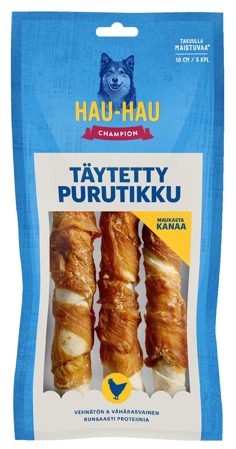 Hau-Hau Champion Täytetty purutikku on tuplasti herkullinen puruluu koirakaverillesi! Kanafileeseen käärityn naudannahkaluun sisällä on herkullinen kananmaksatäyte. Puruluiden pureskelu koiralle lajityypillistä tekemistä, joka myös auttaa pitämään huolta koirasi hampaista. Kaksi kokoa isoille ja pienille koirille.