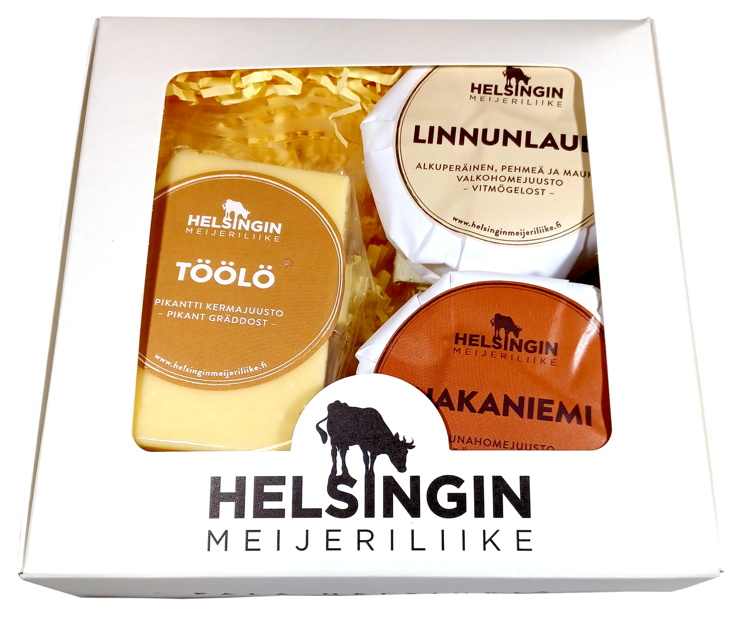 Kolmen juuston lahjapakkaus sisältää juustot Töölö (pikantti kermajuusto), Hakaniemi (miellyttävä punahomejuusto) ja Linnunlaulu (perinteinen valkohomejuusto).