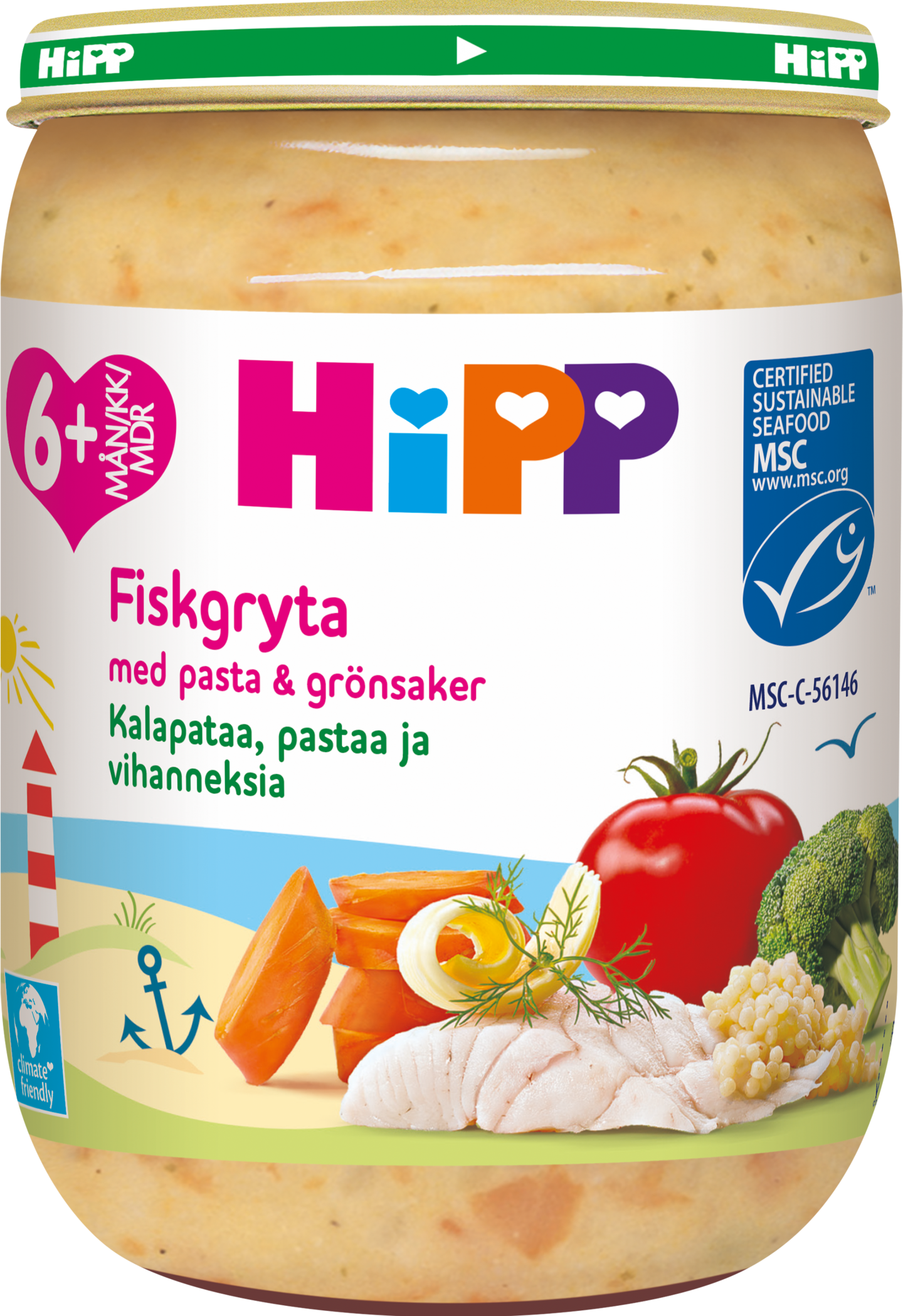 Vihannekset* 33 % (porkkana*, parsakaali*, tomaatti*, sipuli*), vesi, keitetty pasta* (durumVEHNÄ*) 15 %, alaskanseiti (KALA)10,5 %, rasvatonMAITO*, riisitärkkelys*, rapsiöljy* 1,6 %, VOI*, sitruunatäysmehu* tiivisteestä, mausteet*. Saattaa sisältää pieniä määriä KANANMUNAA*. *Luomusertifioitu ainesosa. 86 % maatalousperäisistä ainesosista on luomutuotettuja. (DE-ÖKO-001). Peräisin MSC-sertifioidusta, kestävän kalastuksen mukaisesta kalakannasta.