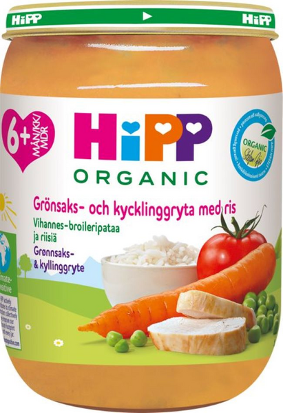 HiPP ilmastopositiiviset ateriat on valmistettu huolella parhaista luonnonmukaisista raaka-aineista. Siksi ne ovat mieluisia ja maistuvat hyviltä. Kaikki reseptimme on laadittu ravitsemusasiantuntijoiden kanssa, jotta voit olla varma, että lapsesi saa ruoasta kaikki tarvitsemansa hyödyt. HiPP Luomu Vihannes-broileripataa ja riisiä. Vain parhaista luomuraaka-aineista huolella valmistettu lämminruoka. Alkaen 6 kuukauden ikäisille. Sopii lounaaksi tai illalliseksi.