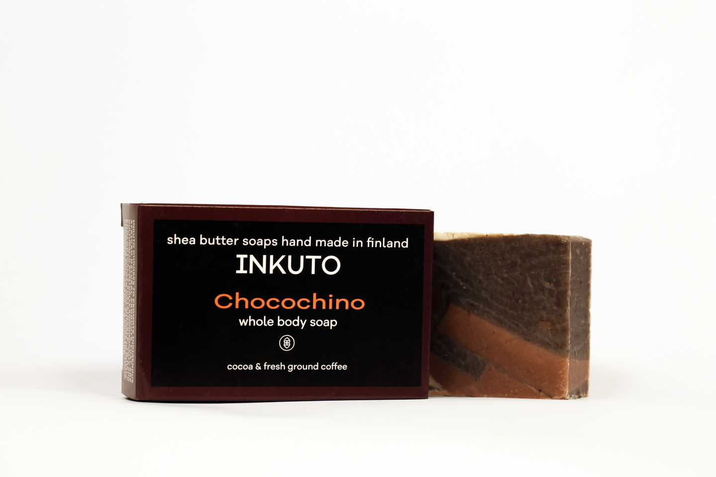 Aloita päiväsi pienellä luxuksella Inkuton Chocochino suklaakahvi-saippualla! Tämä ylellinen saippua on tehty käsin, perinteisillä kylmäprosessin menetelmillä ja se on täydellinen hellimään sinua päästä varpaisiin! Jauhettu kahvi kuorii ja elävöittää ihoasi, ja täyteläinen suklaan tuoksu hemmottelee kaikkia aistejasi. Sheavoi ja kookosöljy ravitsevat ja hoitavat ihoasi, jättäen sen pehmeäksi ja silkkiseksi. Auringonkukkaöljy tuo extra ripauksen kosteutta, tehden saippuasta täydellisen jopa kaikkein herkimmille ihoille. Hemmottele itseäsi suklaakahvi-saippualla joka aamu ja nauti sen tuomasta ylellisestä tunteesta koko päivän.