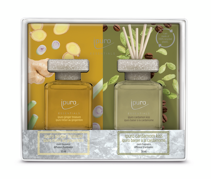 iPuro huonetuoksu luo tunnelman jokaiseen tilaan. Cardamom Kiss huonetuoksu on maisteinen sekoitus kanelia, neilikkaa ja lämpimän sitruksisia vivahteita. Ginger Treasure huonetuoksun sisältämät raikas inkivääri, aistikas sitruunaruoho ja hento makean karamellin tuoksu kuljettavat sinut taianomaiselle matkalle. iPuro tuoksut on kehitelty Grassen kaupungissa, Ranskassa. Kaupunki on hajuvesiteollisuuden keskuspaikka. Kaikki Ipuro-tuotteet valmistetaan Euroopassa tarkan laadunvalvonnan alla. Tuoksuissa käytetään vain luonnollisia tai luontaisen kaltaisia korkealaatuisia tuoksuja ja aromeja.