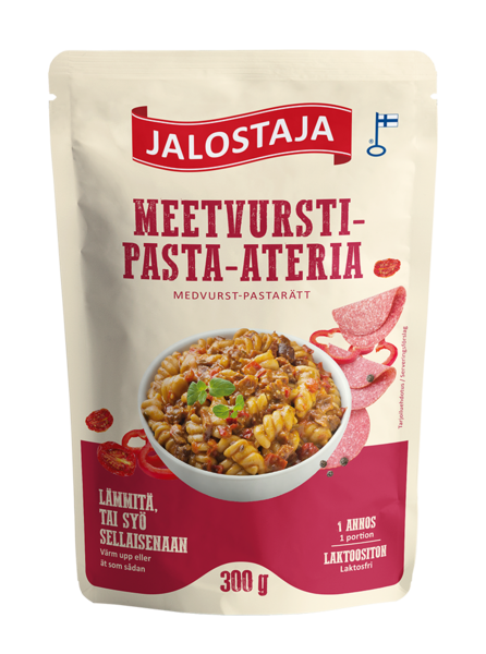 LaktoositonTästä ei ruoanlaitto enää helpommaksi mene – koko ateria on valmiina yhdessä pussissa! Jalostajan meetvursti-pasta-ateria on täynnä makua, ja sopii helppoutensa ansiosta nautittavaksi niin lounaana kuin retkieväänä tai mökilläkin.