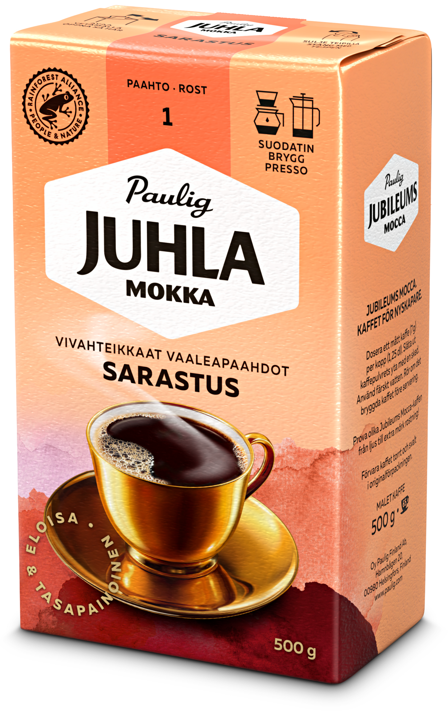 Juhla Mokka Sarastus on vivahteikas vaaleapaahtoinen kahvisekoitus hedelmäisen makeilla vivahteilla. Kahvin aromikas makumaailma on peräisin Etelä-Amerikan ja Afrikan parhaista 100 % arabica-kahvilaaduista. Eloisa ja tasapainoinen. Paahtoaste 1. Rainforest Alliance -sertifioitu.