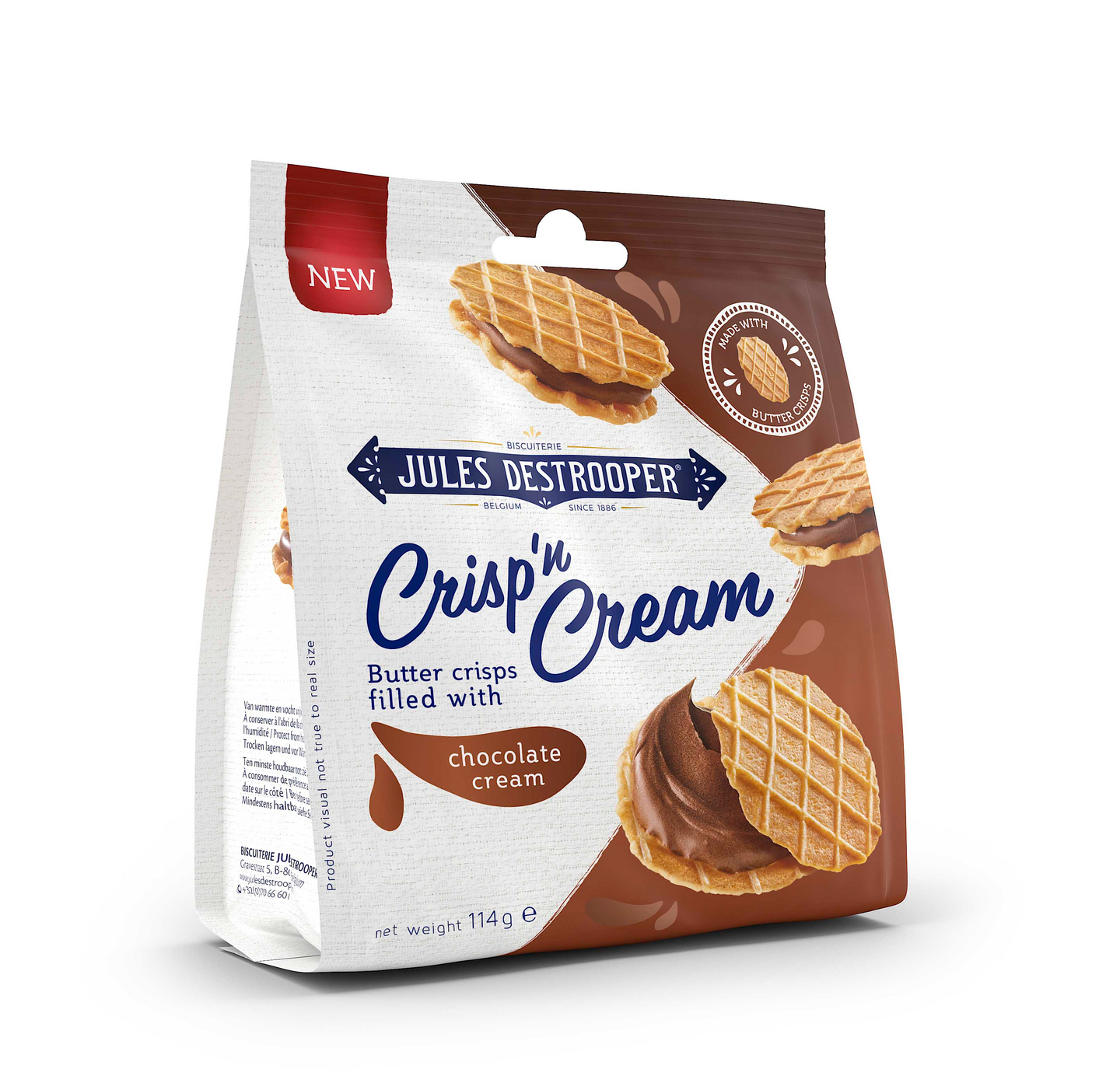 Jules Destrooper Crisp'n Cream Chocolate 114g, voikeksejä joissa suklaakreemitäytettä