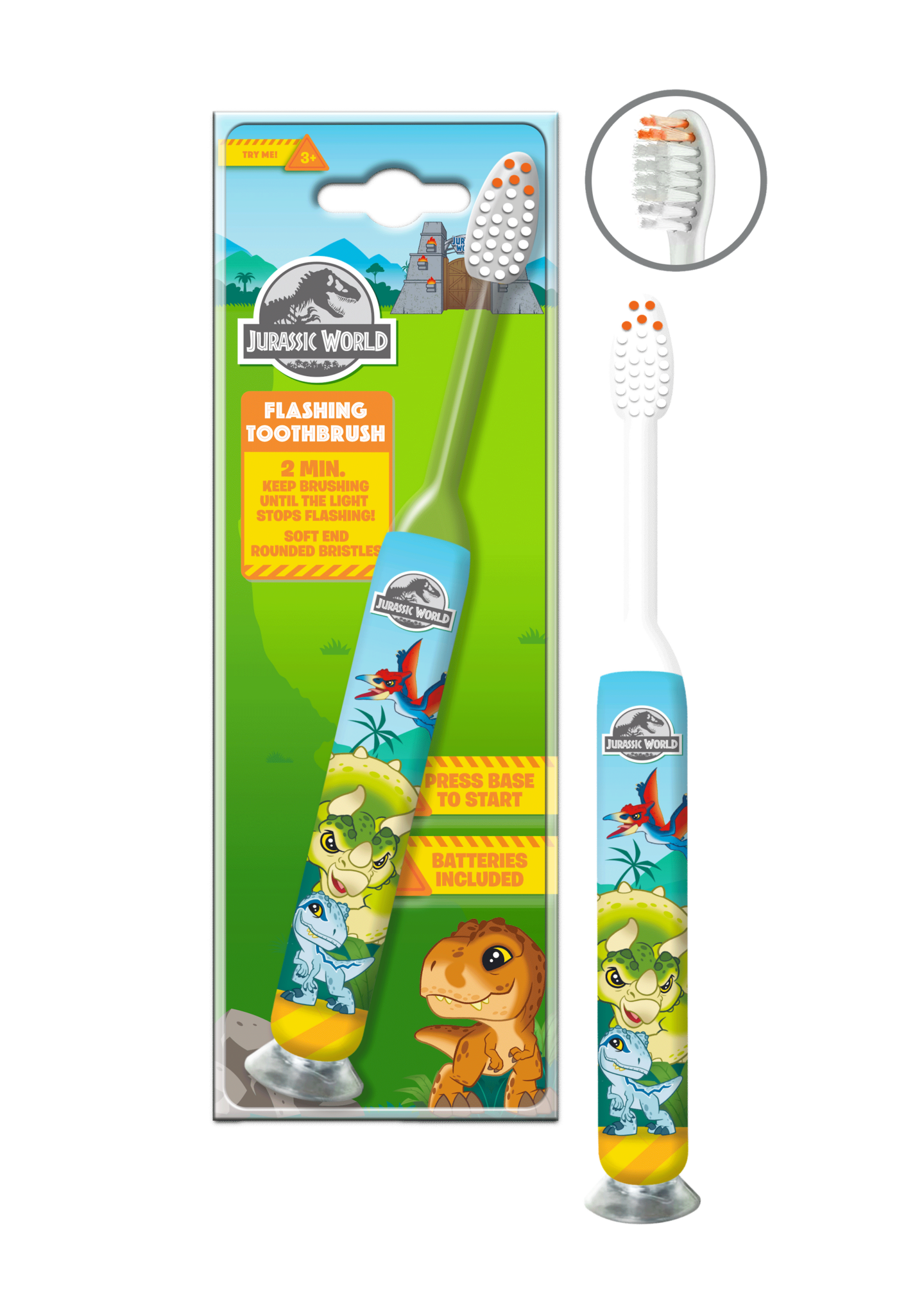 Tee hampaidenpesusta hauskaa lapsille Jurassic world-hammasharjalla. Harjassa on ajastettu vilkkuva valo, jonka avulla lapsi oppii harjaamaan hampaita riittävän pitkään.