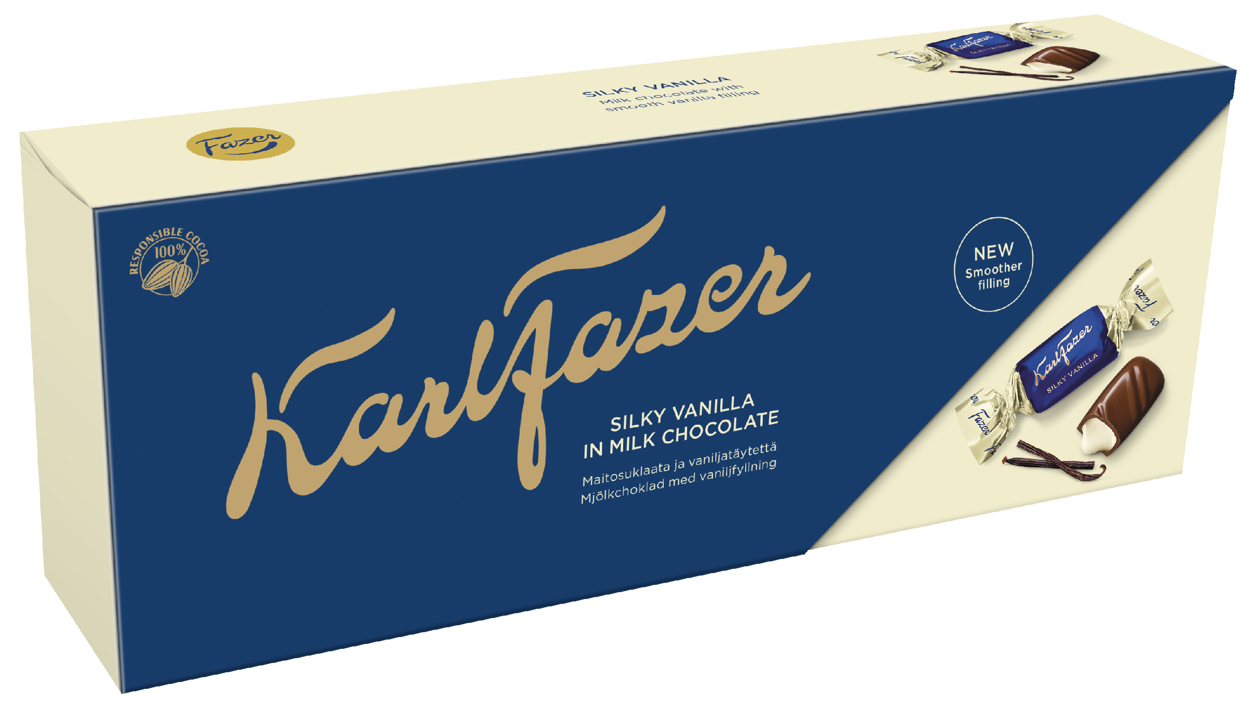 Suomen rakastetuin suklaa, jonka ainutlaatuisen täyteläisen maun ovat taanneet parhaat raaka-aineet jo vuodesta 1922 saakka. Karl Fazer vaniljakonvehdit ovat täydellinen yhdistelmä maitosuklaata ja pehmeää vaniljatäytettä. Anna parhaisiin hetkiin sopiva rasia lahjaksi tai nautiskele ystävien kanssa. Noudatamme kaakaonhankinnassamme Fazerin kaakaovisiota. Lue lisää www.fazercocoavision.com.