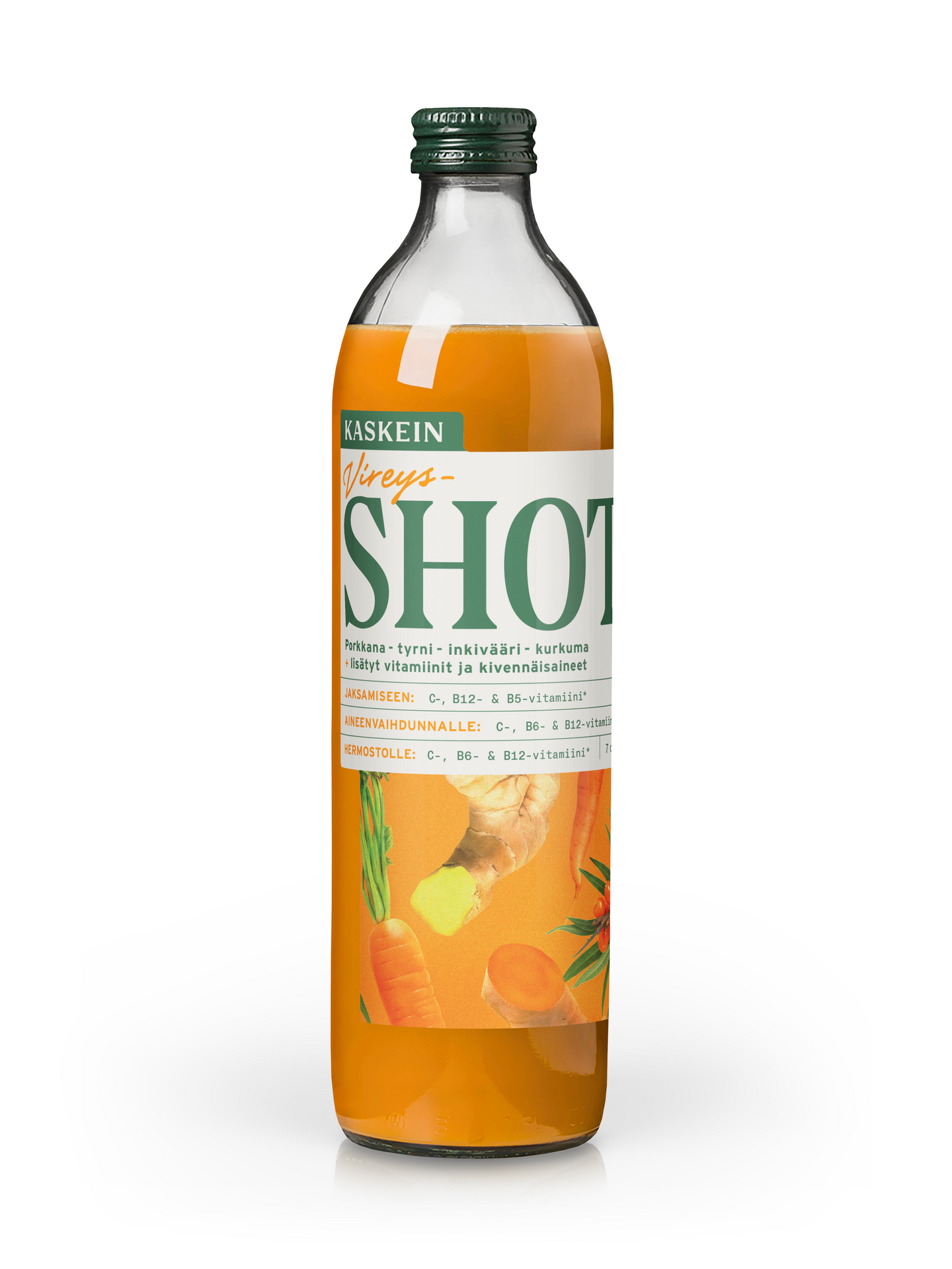 Raikas ja pirteän oranssi shot tuo energiaa aamuihin ja hetkiin, kun kaipaat lisäboostia. Luonnollinen sekoitus tyrniä, porkkanaa, inkivääriä ja kurkumaa tukee jaksamista ja aineenvaihduntaa ilman lisättyä sokeria tai lisäaineita. Vireys-Shot sisältää vitamiineja (C, B6, B12, B5) ja kalsiumia, jotka auttavat vähentämään väsymystä sekä tukevat hermoston normaalia toimintaa. Funktionaaliset Kaskein Shot -tuotteet on valmistettu parhaista luonnon raaka-aineista ja tarkkaan valituista ravintolisistä. Tuotteet perustuvat täysmehuun ilman lisättyä sokeria, maku- tai säilöntäaineita. Yhdestä pullosta saat seitsemän päivän annokset – sellaisenaan tai smoothien seassa.