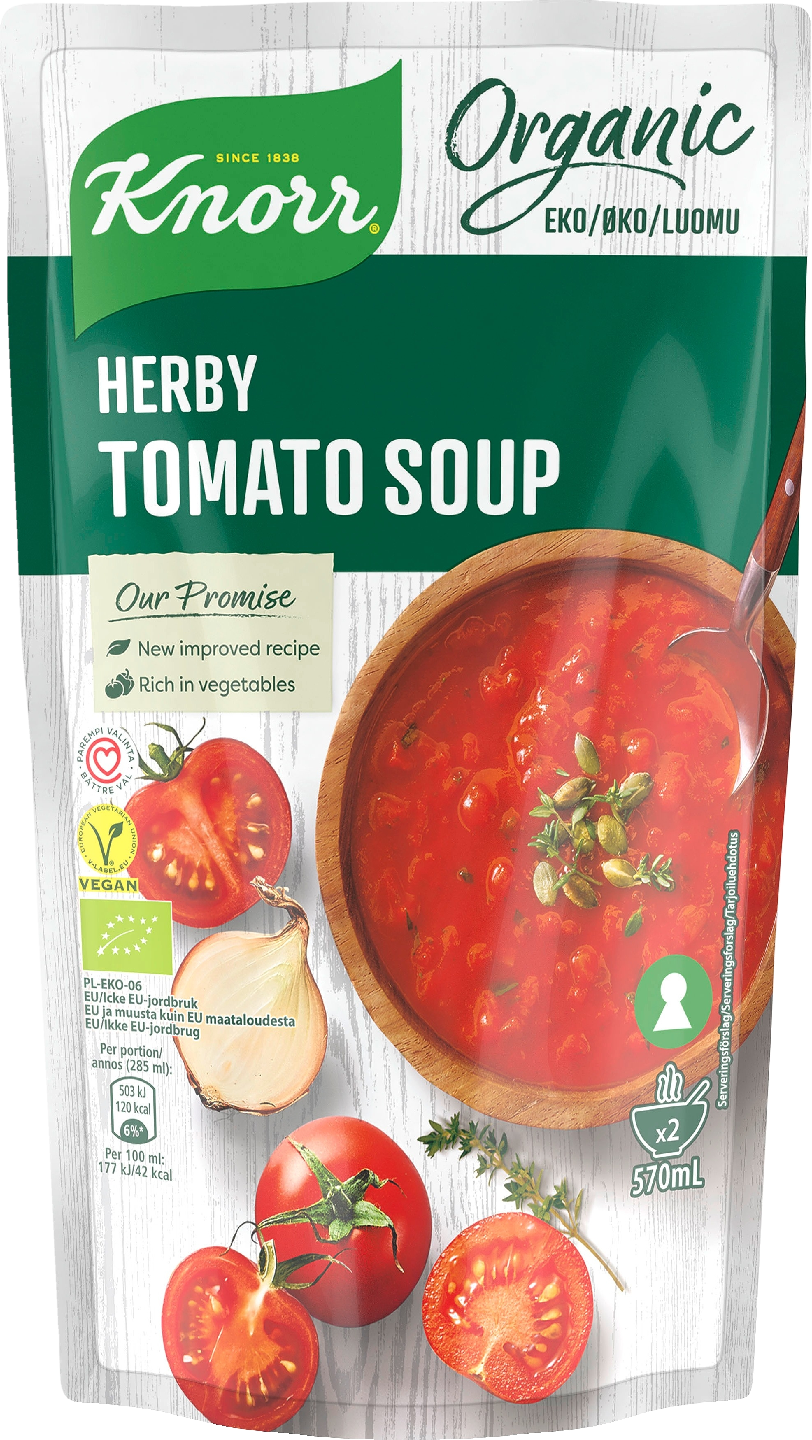 Knorrin luomu tomaattikeitto yrteillä on nopea ja helppo valmistaa ja täydellinen lounas tai illallinen kahdelle. Lisää lämmitetyn keiton päälle terveellisiä siemeniä tuomaan rouskuvuutta ja rakennetta ja ruokaisuutta raejuustolla. Knorr valmiskeitot on valmistettu korkealaatuisista raaka-aineista ja ne on helppo valmistaa: lämmitä keitto kattilassa tai mikrossa ja nauti.
