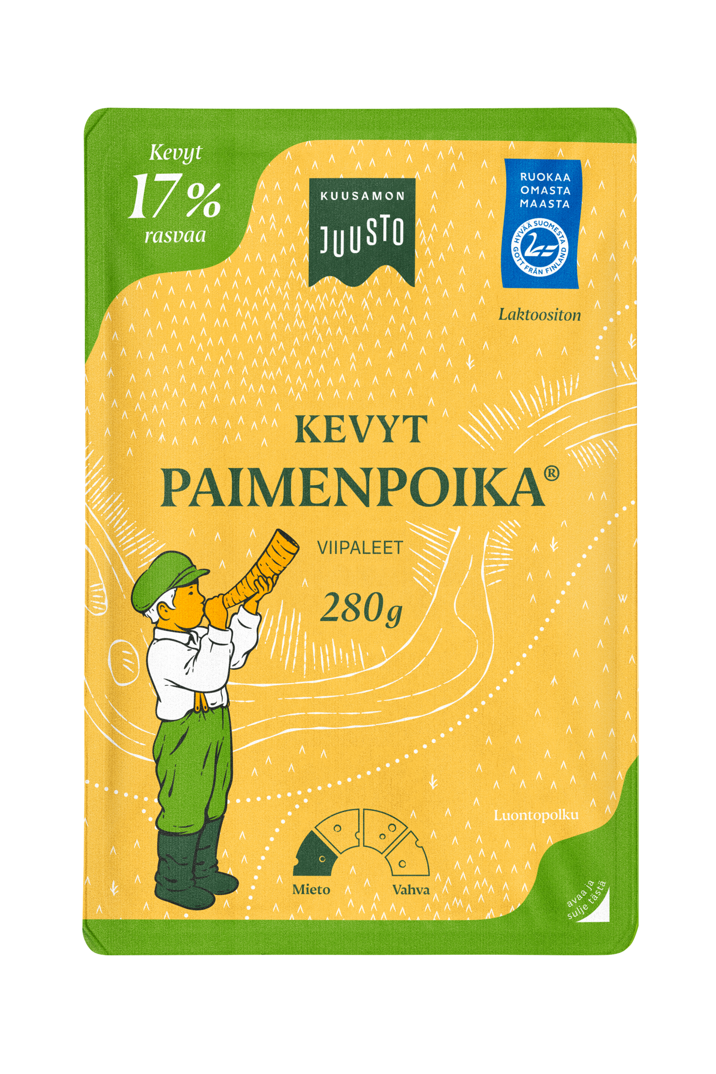LaktoositonKuusamon Juuston Paimenpoika® kevyt 17% kermajuustoviipaleet on mieto ja koko perheelle maistuva laktoositon arkijuusto. Valmistettu Suomen pohjoisimmassa juustolassa suomalaisesta maidosta.