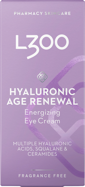 L300 Hyaluronic Age Renewal Eye Cream on silmänympärysvoide, joka täyttää hienoja juonteita ja vähentää turvotusta silmien alla antaen välittömästi kirkkaamman ilmeen. Voide lisää kollageenituotantoa, ja tuloksena on kiinteämpi silmänympärysiho. Sisältää hyaluronihappoa kahdessa eri molekyylikoossa ja skvalaania kosteuden lisäämiseksi. Keramidit parantavat ihon rakennetta ja tekevät ihosta sileämmän. Dokumentoitu vaikutus 4 viikon käytön jälkeen: silmänympärysiho on kiinteämpi ja ihossa on vähemmän hienoja juonteita. Hajusteeton. Sopii kaikille ihotyypeille. Dermatologisesti testattu herkällä iholla.