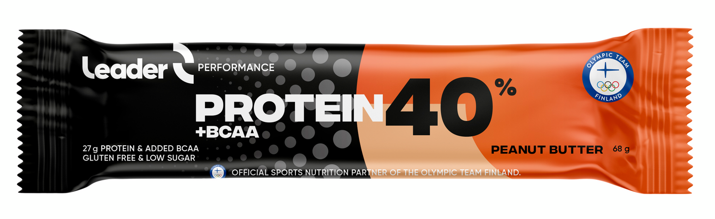 GluteenitonLeader Performance Protein 40% + BCAA on funktionaalinen proteiinipatukka, jossa on erinomainen ravintoainesisältö sekä täyteläisen maukas makuprofiili. Patukka sisältää 27g laadukasta proteiinia ja on samalla gluteeniton ja vähäsokerinen. Patukkaan on myös lisätty ihmiselle välttämättömiä BCAA-aminohappoja vapaassa muodossa, jotka edesauttavat lihaskudoksen hyvinvointia, kehittymistä ja palautumista. Protein 40% + BCAA patukat soveltuvat kuntosaliharjoittelijoille, juoksijoille ja muille aktiiviliikkujille, sekä kaikille niille, jotka etsivät helppoa ja vähäsokerista tapaa lisätä päivittäistä proteiininsaantia.