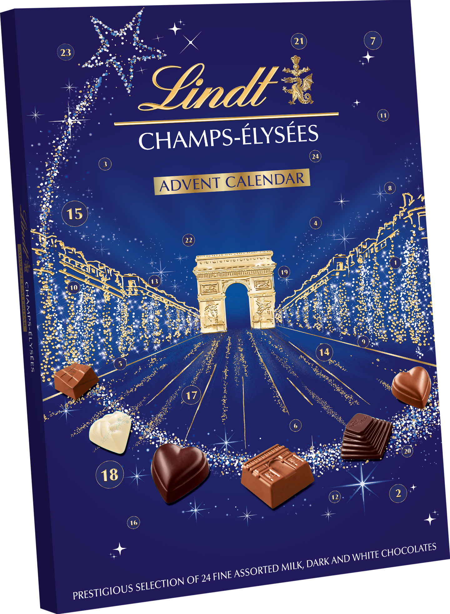 Joulukalenterin tyylikäs yönsininen pakkaus kultaisilla koristeilla on saanut inspiraationsa Pariisissa sijaitsevasta Riemukaaresta. Tämä ylellinen joulukalenteri sisältää hienoimpia suklaakonvehteja, ja sopii täydellisesti lahjaksi.