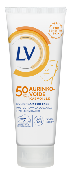 Hajusteeton ja väriaineeton LV Aurinkovoide kasvoille on helposti levittyvä ja imeytyvä korkean suojakertoimen (SPF50) aurinkovoide joka jättää iholle pehmeän mattamaisen tunteen. Aloe vera ja hyaluronihappo kosteuttaa ja hoitaa ihoa. Herkälle iholle sopiva, antaa korkean suojan UVA ja UVB-säteitä vastaan suojaten kasvojen ihoa auringolta ja sen aiheuttamalta ennenaikaiselta vanhenemiselta.