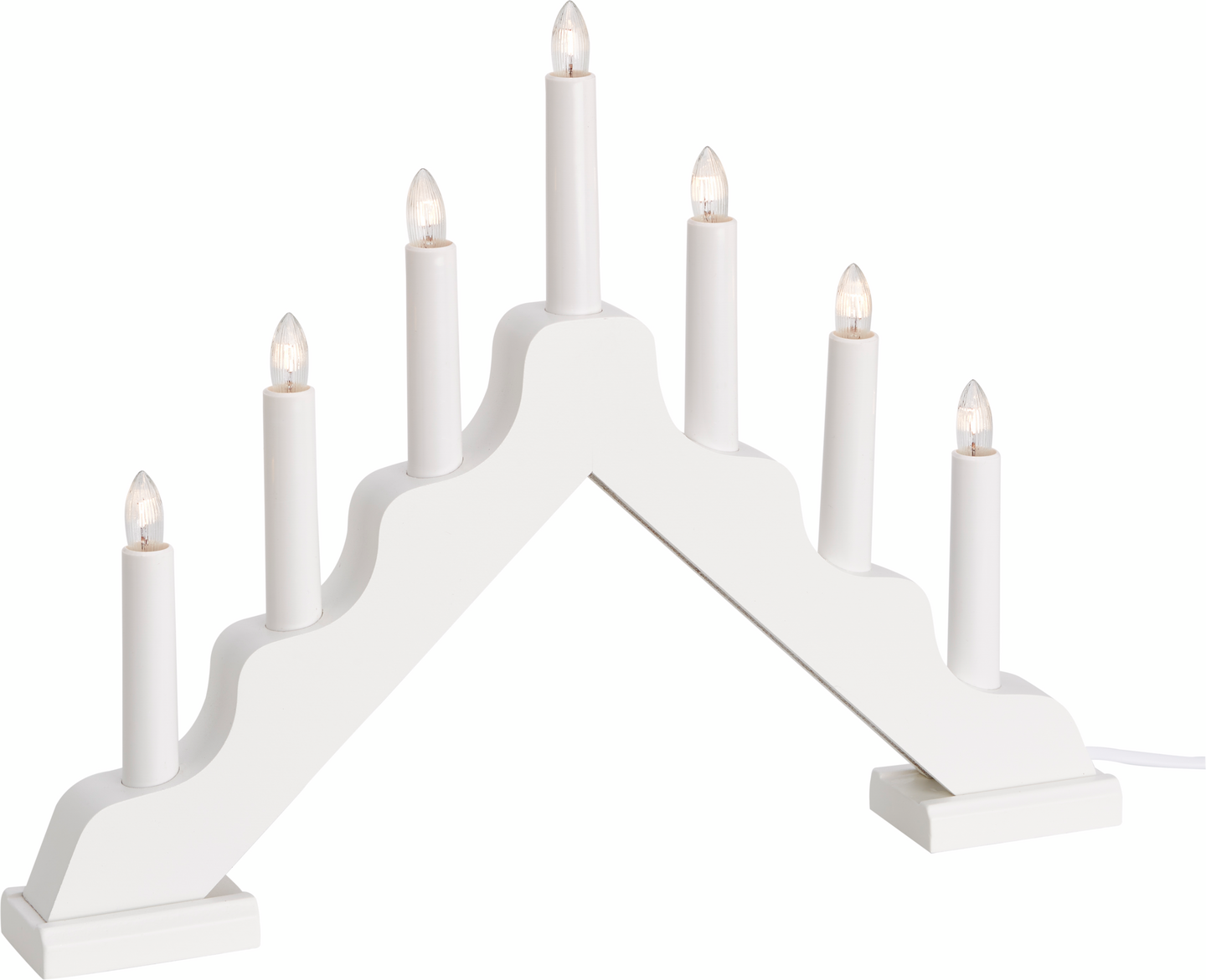 Sisäkäyttöön sopiva valkoinen 7-haarainen kynttelikkö. Kynttelikössä on hillitty koristeellinen muotoilu. Kynttelikön korkeus on 30 cm ja leveys 40 cm.