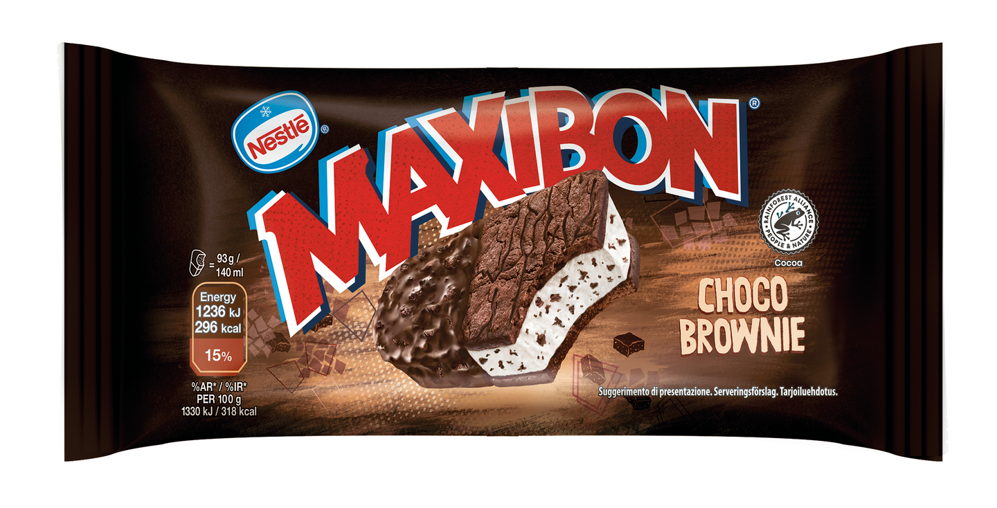 Maxibon Choco Brownie sisältää kermanmakuista jäätelöä suklaabrowniepaloilla, suklaakuorrutetta kaakaosuklaabrowniepaloilla ja suklaabrowniekeksiä.