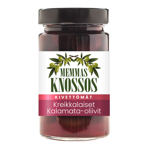 Korkealaatuiset kivettömät Kalamata-oliivit Kreikasta. Suuret oliivit ovat maukkaita naposteltavaksi sellaisenaan sekä sopivat erinomaisesti salaatteihin, pizzan päälle ja ruoanlaittoon.