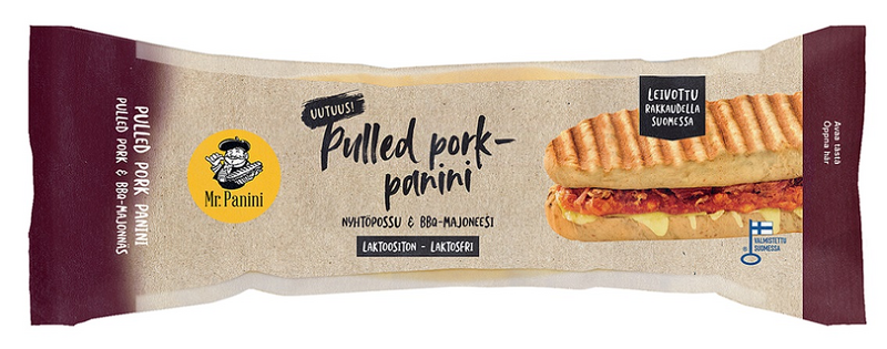 LaktoositonUUTUUS! Mr. Paninin Pulled Pork -panini nostaa veden grilliruoan ystävän kielelle. Rapean, kotimaisista jauhoista leivotun paninileivän välissä on kunnon satsi suussa sulavan mureaksi kypsennettyä suomalaista nyhtöpossua, paninikeittiön omaa pikantin savuista BBQ-majoneesia ja kotimaista juustoa. Makuyhdistelmä on sopivan savuinen, mausteinen ja taatusti mehevä. Paista rapean rouskuvaksi uunissa tai parilassa ja nauti! Tiesitkö muuten, että paninista tulee ihanan rapea ja mehevä myös airfryerissa!