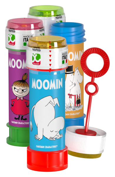 Saippuakuplien puhaltelu on hauskaa kesäistä puuhaa. Muumi-aiheisessa pullossa on 60 ml kuplisnestettä. Ikäsuositus yli 3-vuotiaille.