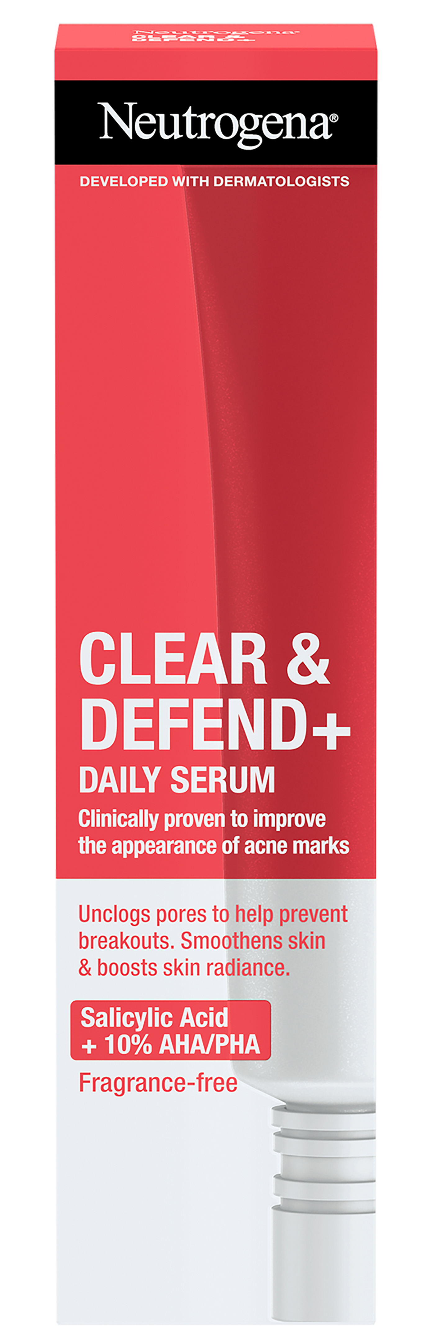Hajustamaton Neutrogena® Clear & Defend+ Daily Serum -kasvoseerumi auttaa ehkäisemään epäpuhtauksia, silottaa ihoa ja lisää ihon hehkua. Seerumi sisältää salisyylihappoa sekä tehokkaan 10 % yhdistelmän AHA- ja PHA-happoja: