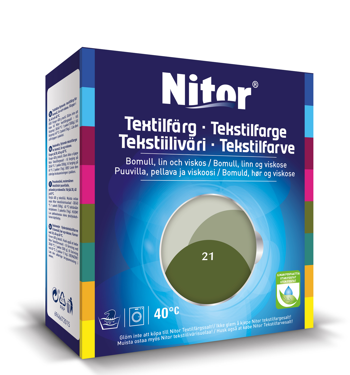 Nitor Tekstiiliväri sopii luonnonmateriaalien sekä selluloosakuitujen kuten puuvillan, pellavan, viskoosin, modaalin, raionin, kupron ja juutin värjäämiseen. Nitor Tekstiiliväripakkaus sisältää 75 ml väriainetta ja 100 g kiinnitysainetta. Yksi pakkaus riittää värjäämään 400 g kuivaa tekstiiliä. Värjäyksessä käytetään kiinnitteenä Nitor Tekstiilivärisuolaa. Värjättäessä 40°C:ssa tarvitaan 1 pkt Tekstiilivärisuolaa ja 60°C:ssa 2 pkt. Uudistettu - ei sisällä fosfaatteja.