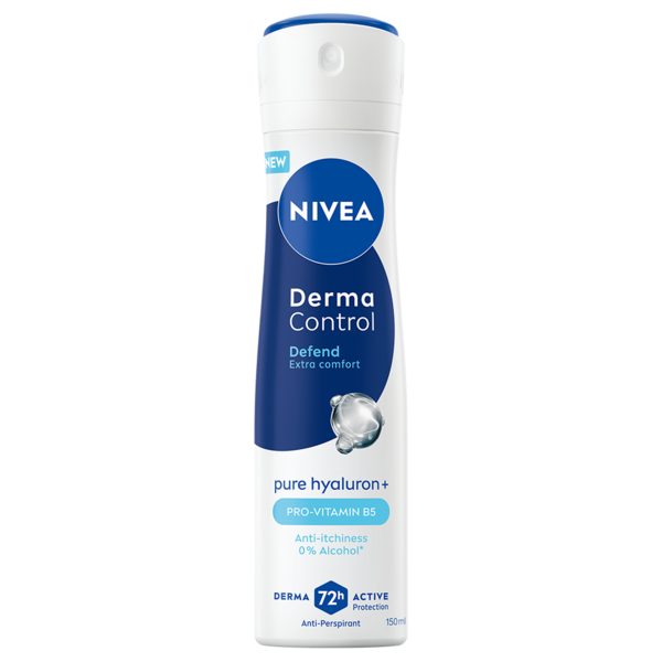 NIVEA Derma Control Defend Deo Spray -antiperspirantti antaa miellyttävän tunteen ja ehkäisee kutinaa, tarjoten samalla luotettavan 72 tunnin antiperspiranttisuojan. Edistyksellinen, hyaluronihappoa ja B5-provitamiinia sisältävä koostumus suojaa ihoa sheivauksen jälkeiseltä ärsytykseltä ja vähentää vaatteiden aiheuttamaa hankausta, samalla kun se ravitsee kainaloiden ihoa ja antaa iholle pehmeän tunteen.