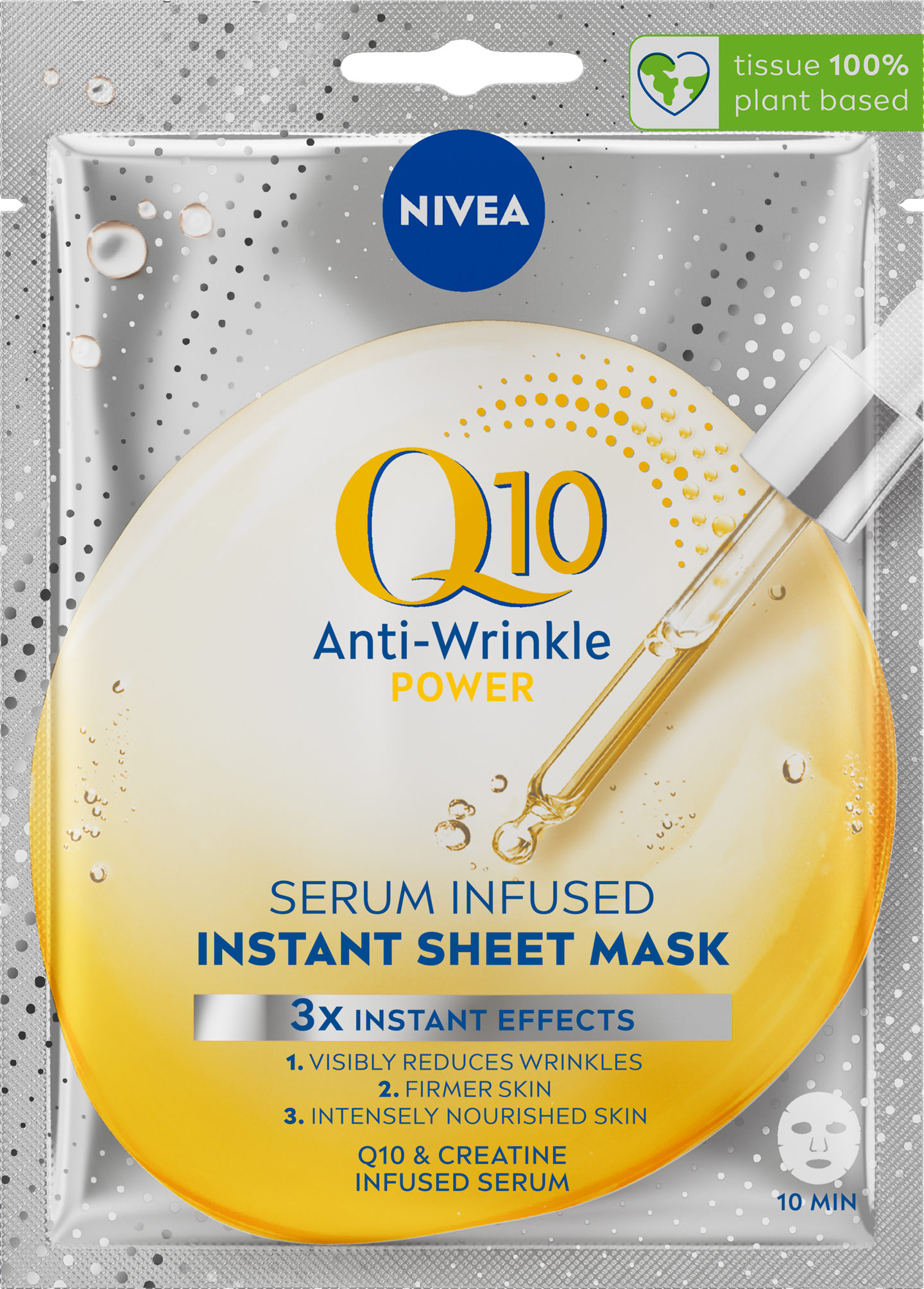 NIVEA Q10 Anti-wrinkle Power Serum Infused Sheet Mask -kasvonaamio tarjoaa 3x välittömän vaikutuksen: 1. Vähentää ryppyjä näkyvästi. 2. Kiinteyttää. 3. Ravitsee ihoa. Sisältää puoli pulloa seerumia*, jossa yhdistyvät tehokas, puhdas Q10-koentsyymi ja energiaa antava kreatiini. Kangasnaamio tekee ihosta ihanan sileän ja kiinteämmän. Naamio antaa ihollesi tehokasta anti-age-hoitoa tasoittaen ryppyjä ja pieniä juonteita. Tekee ihostasi raikkaan ja hyvinvoivan näköisen. Biohajoava kangasnaamio.