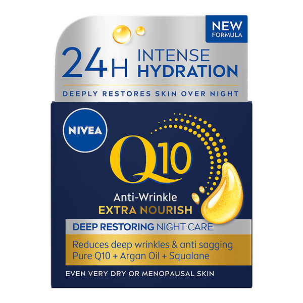 NIVEA Q10 Anti-Wrinkle Extra Nourish Deep Restoring Night Cream -yövoide sisältää puhdasta Q10:ntä, joka antaa ihosoluille energiaa ja korjaa ryppyjä sisältäpäin*, luomu arganöljyä, joka hoitaa ja kosteuttaa ihoa tehokkaasti, sekä skvalaania, joka vahvistaa ihoa ja ehkäisee sen kuivumista. Kasvovoide korjaa ihoa syvältä yön aikana ja tekee ihosta pehmeän ja joustavan. Sopii erittäin kuivalle tai vaihdevuosi-ikäiselle iholle. Tehokkuus kliinisesti todistettu. Dermatologisesti testattu.