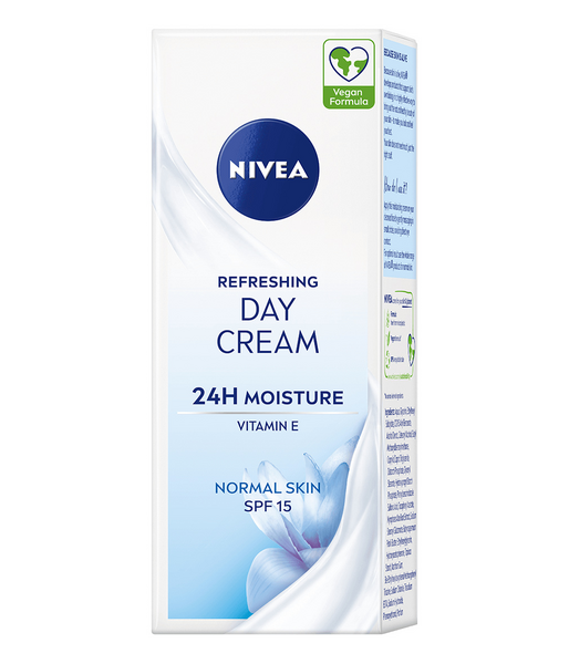 NIVEA Refreshing Day Cream SK15 -päivävoiteen kevyt koostumus antaa iholle raikasta kosteutusta 24 tunnin ajan. Sisältää: