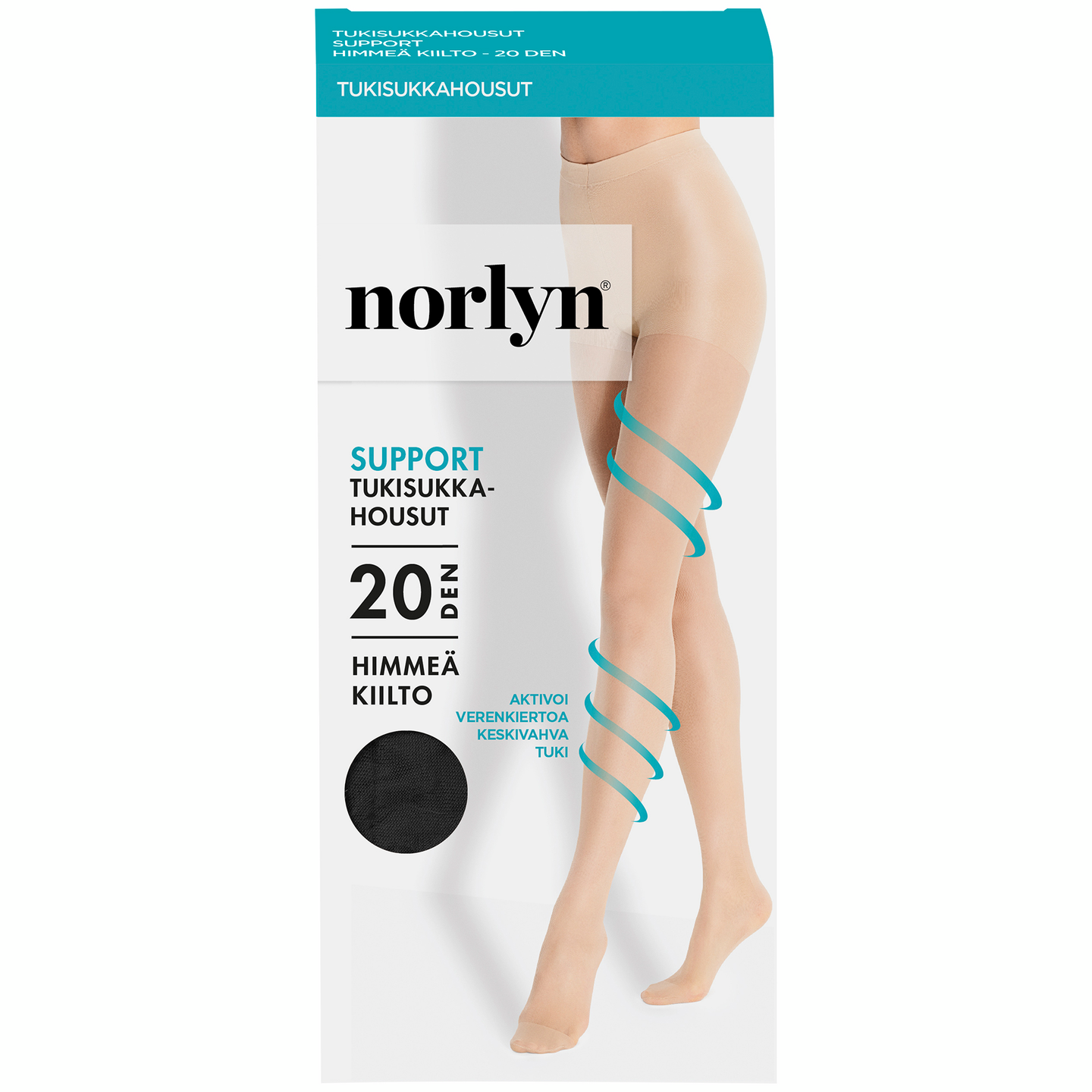 Norlynin 20 denierin himmeäkiiltoiset tukisukkahousut edistävät jalkojen hyvää oloa. Keskivahva tuki virkistää jalkoja sekä aktivoi verenkiertoa. Kevyesti muotoileva housuosa antaa vartalolle kauniin siluetin. Jalat tuntuvat ja näyttävät hyvältä koko päivän. Haarakiila lisää käyttömukavuutta. Kärki- ja pohjavahvike lisäävät kestävyyttä. Koostumus: 83% polyamidi, 17% elastaani