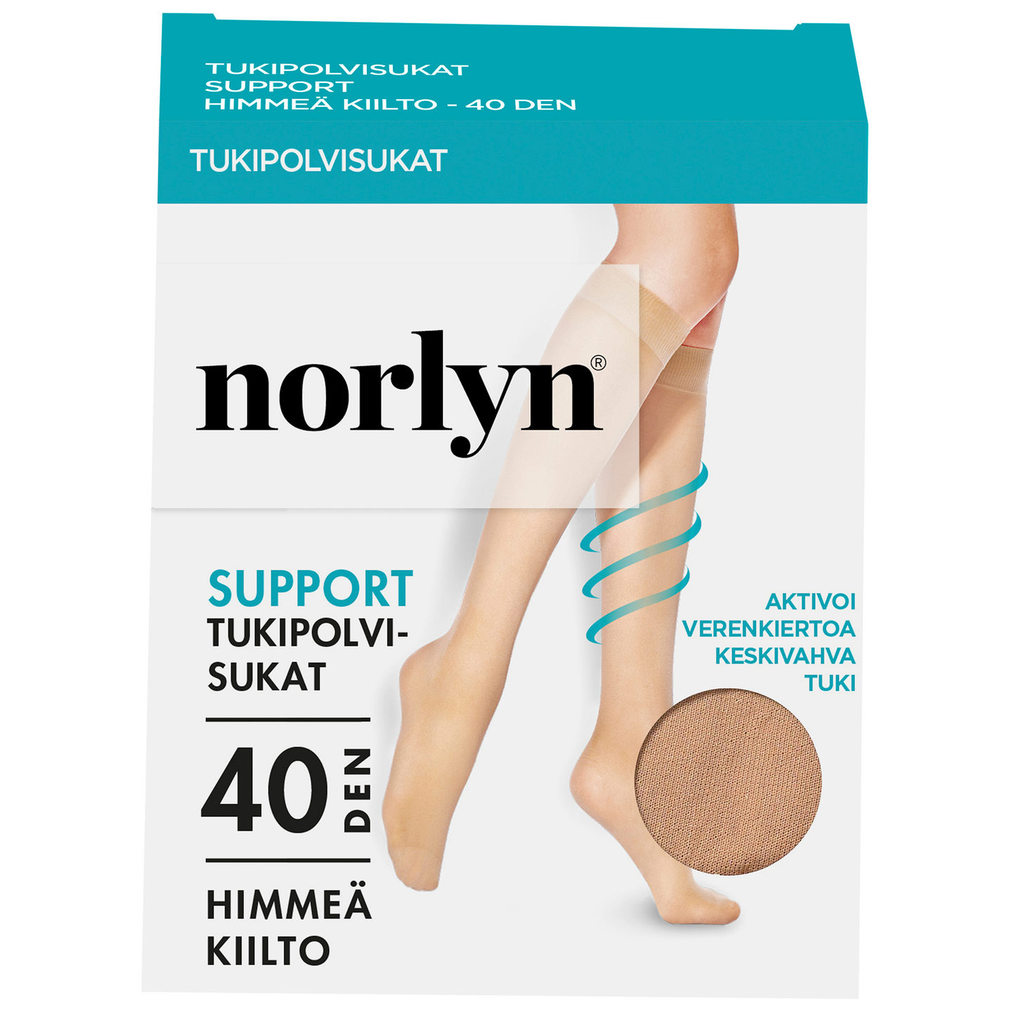 Norlynin 40 denierin himmeäkiiltoiset jalkoja virkistävät tukipolvisukat keskivahvalla tuella. Leveä ja sileäpintainen resori. Huomaamaton kärkivahvike. Koostumus: 85% polyamidi, 15% elastaani