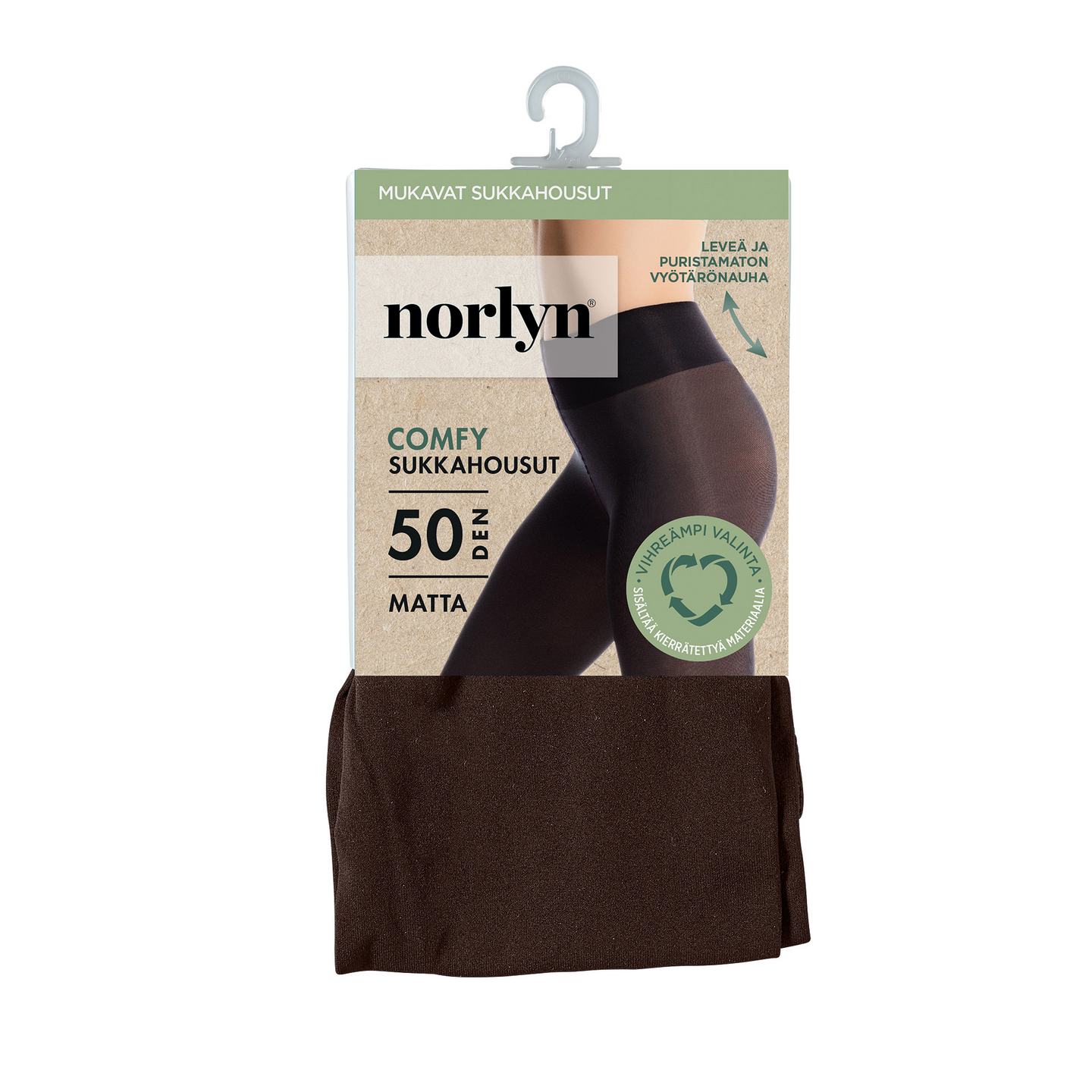 Norlynin 50 denierin mattapintaiset sukkahousut. Erittäin leveä vyötärönauha ja joustava 3D-rakenne lisäävät käyttömukavuutta ja parantavat istuvuutta. Sukkahousuissa puuvillahaarakiila ja huomaamaton kärkivahvike. Tuotteen materiaalista 46% on kierrätettyä. Koostumus: 46% kierrätetty polyamidi, 44% polyamidi, 10% elastaani