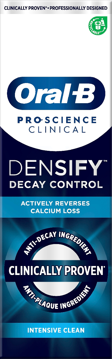 Oral-B Clinical Decay Control Intense Cleaning -hammastahna pidentää hampaiden elinikää. Se korjaa aktiivisesti kalsiumin menetystä. Oral-B:n ainutlaatuinen tinafluoridiyhdistelmä tarjoaa tavalliseen fluorihammastahnaan verrattuna ylivoimaisen suojan ruoan syövyttävien happojen aiheuttamaa kiilteen kulumista vastaan myös harjausten välillä. Kahdesti päivässä käytettynä se korjaa kalsiumin menetystä lisäämällä aktiivisesti kiilteen tiheyttä kahdella tärkeällä alueella: hampaan pinnat ja ienraja