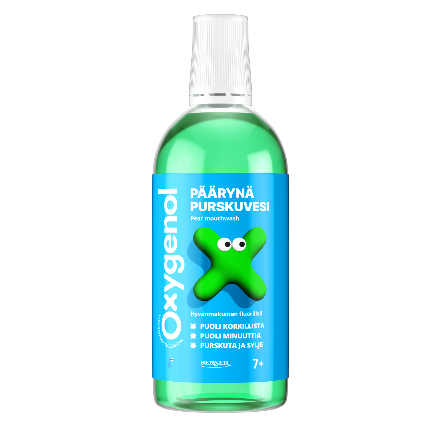 Kotimainen raikkaan päärynän makuinen purskuvesi 7+ vuotiaille. Mieto ja hyvänmakuinen lisäfluori +ksylitoli käytettäväksi 1-2 kertaa päivässä. Auttaa katkaisemaan happohyökkäyksen välipalan/juoman jälkeen ja/tai viimeistelee puhdistuksen harjauksen jälkeen. Hyödyllinen apu myös oikomishoidon aikana, kun mekaaninen puhdistaminen on hankalaa. Purskuveden säännöllinen käyttö hampaiden harjauksen lisänä ehkäisee ja auttaa korjaamaan kiillevaurioita sekä suojaa kiillettä eroosiolta. Sisältää natriumfluoridia (225ppm F) ja kotimaista ksylitolia. Fluori vahvistaa hammaskiillettä ja suojaa reikiintymiseltä, ksylitoli ehkäisee plakin muodostumista. Purskuvedet eivät sisällä SLS (natriumlauryylisulfaattia) ja sopivat siksi myös afta-herkille. Alkoholiton, ei kuivata suun limakalvoja. Vegaaninen. Pullo 100% kierrätetystä muovista. Kierrätettävä.