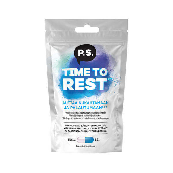 Tässä tulee P.S. Nutrition – uusi ravintolisäsarja! Time To Rest on kumppanisi matkalla höyhensaarille! Olemme tarkkaan valinneet yhdistelmän unibuustereita, kuten melatoniinia ja rauhoittavaa passionkukkaa, jotka eivät vain nopeuta matkaasi unien maahan, vaan myös nopeuttavat palautumista hyvien unien ansiosta. Ei enää lampaiden laskentaa, vain rauhaa, tyyneyttä ja täydellinen startti seuraavaan päivään!