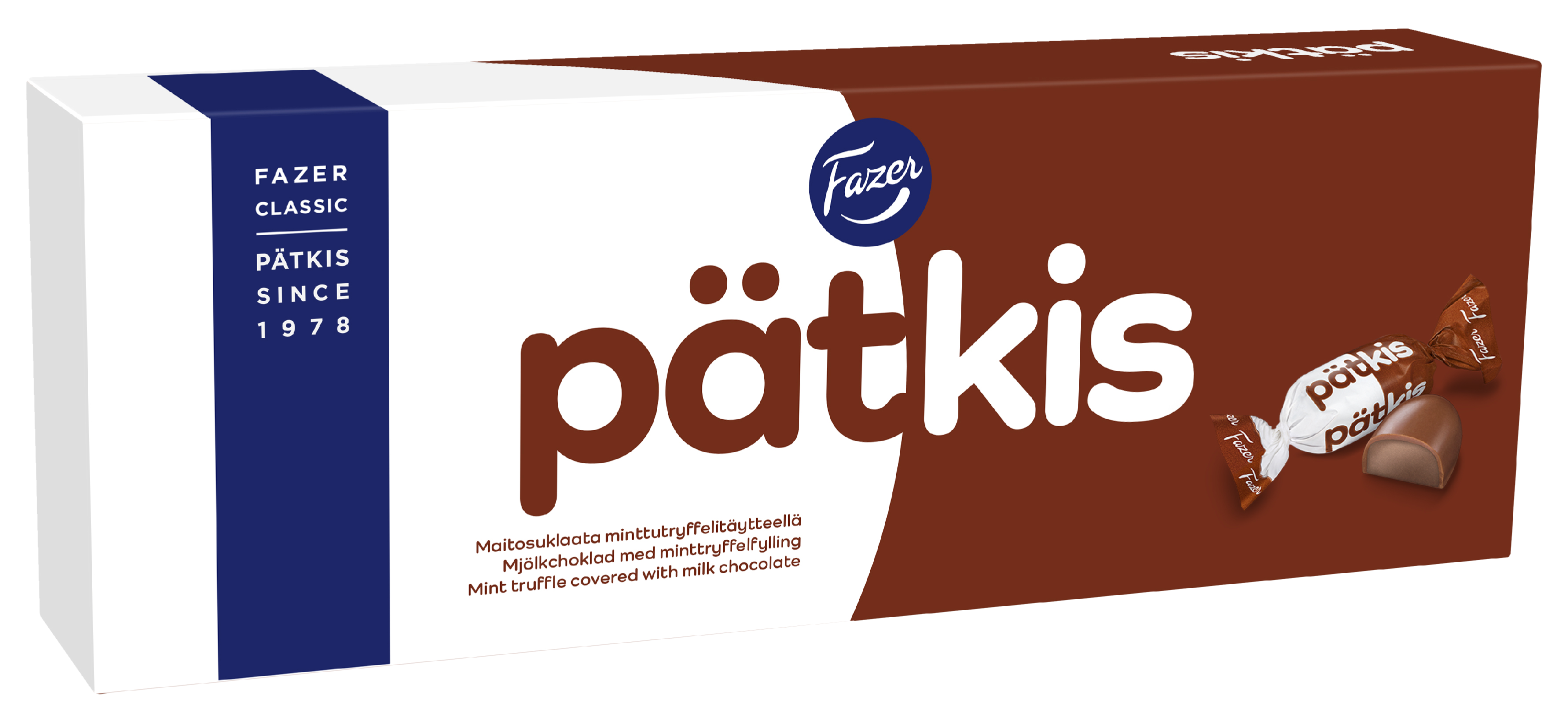 Pätkis on pienestä koostaan huolimatta ollut suomalaisten suursuosikki jo vuodesta 1978. Rakastettu maitosuklaalla kuorrutettu minttutryffeli maistuu koko perheelle. Ilahduta ystäviä Pätkis-konvehdeilla tai nauti konvehti tai pari kahvin kanssa. Noudatamme kaakaonhankinnassamme Fazerin kaakaovisiota. Lue lisää www.fazercocoavision.com.