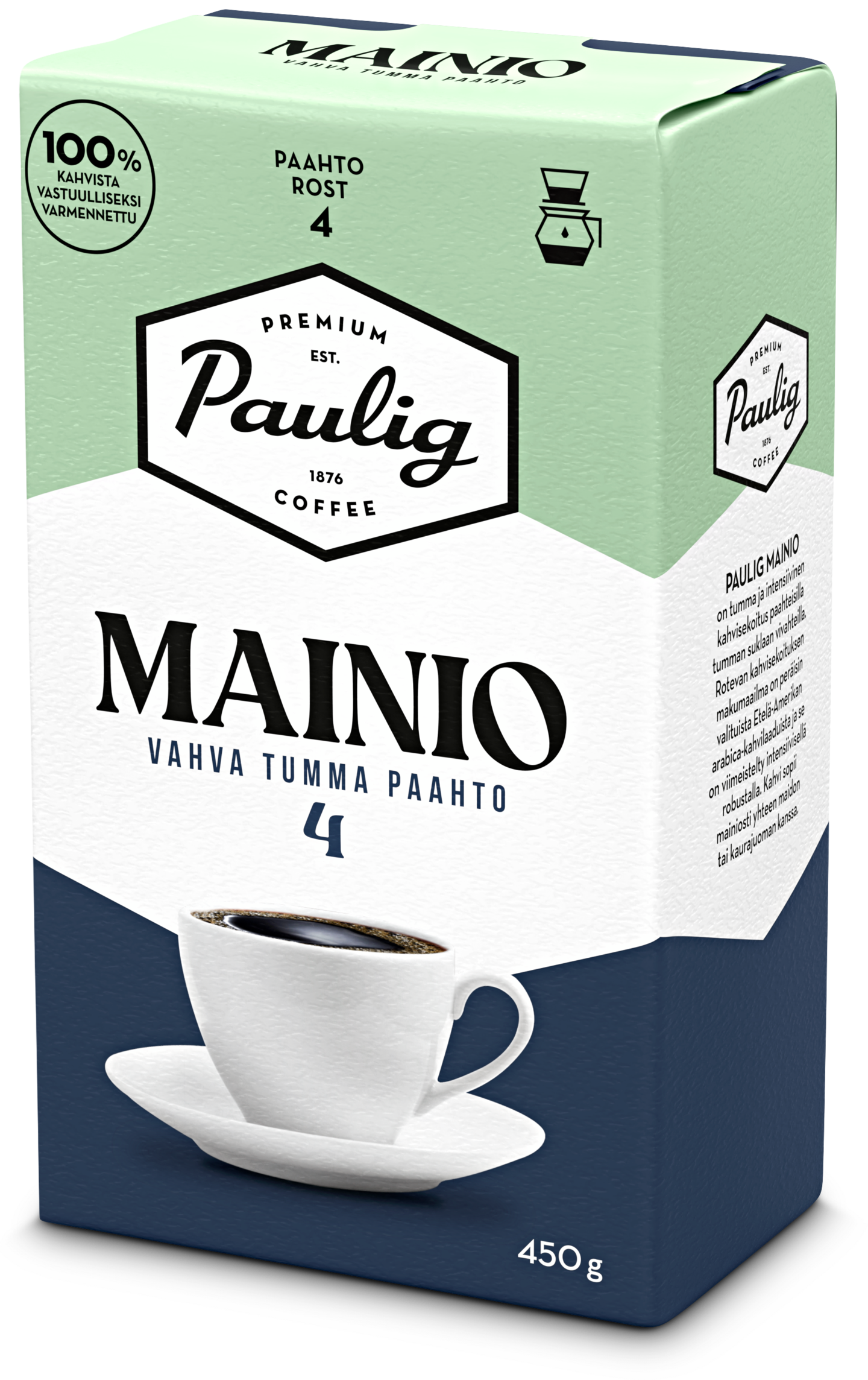 PAULIG MAINIO on tumma ja intensiivinen kahvisekoitus paahteisilla tumman suklaan vivahteilla. Rotevan kahvisekoituksen makumaailma on peräisin valituista Etelä-Amerikan arabica-kahvilaaduista ja se on viimeistelty intensiivisellä robustalla. Kahvi sopii mainiosti yhteen maidon tai kaurajuoman kanssa.