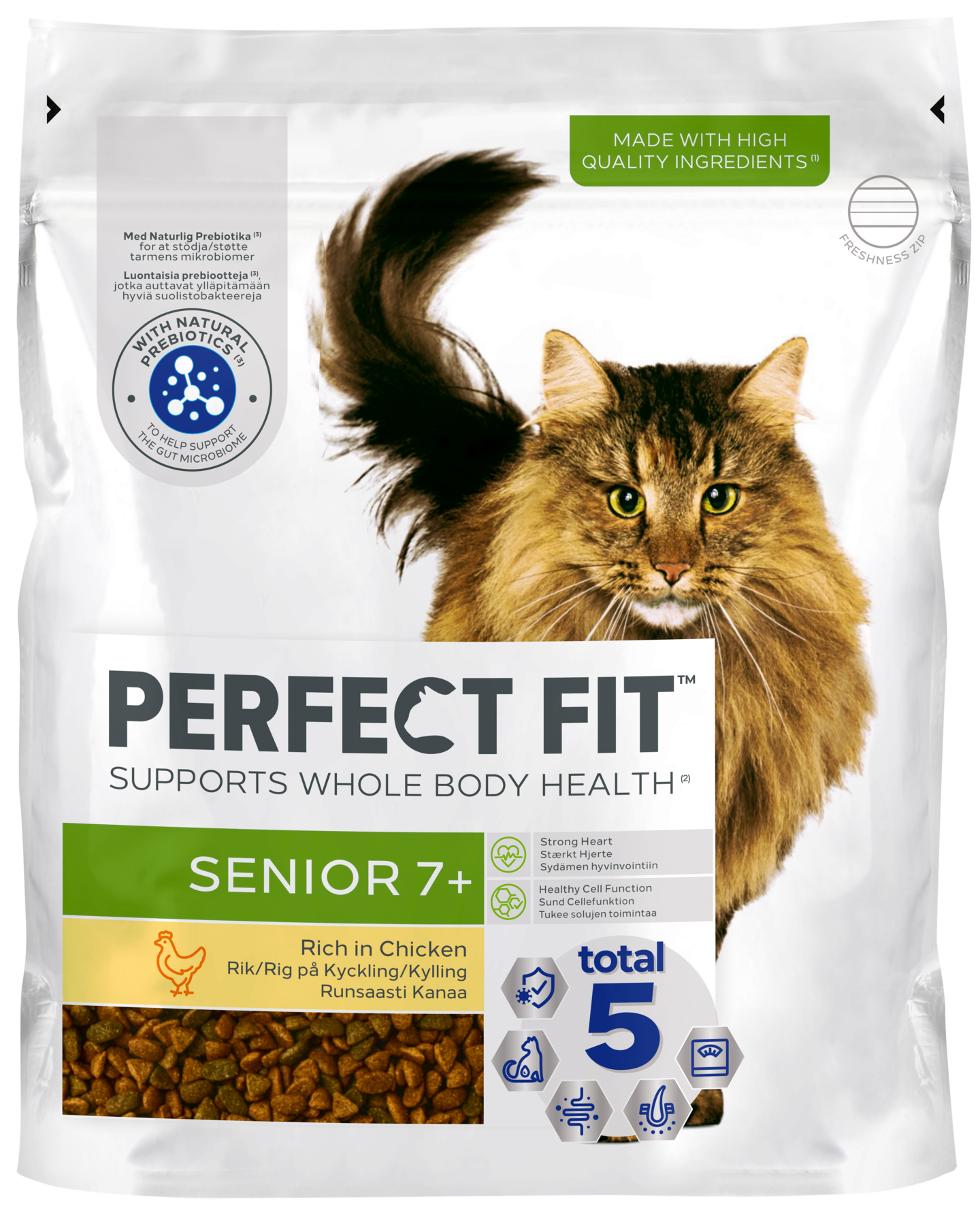 Ainutlaatuisen PERFECT FIT™ Total 5 -koostumuksen lisäksi Senior 7+ tuo tullessaan kolme täydentävää etua seniorikissojen erityistarpeisiin: