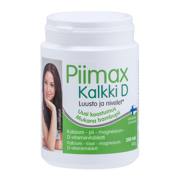 LaktoositonPiimax Kalkki D:n sisältämä *kalsium, magnesium ja D3-vitamiini auttavat ylläpitämään luuston ja hampaiden pysymistä normaaleina. D3-vitamiini edistää kalsiumin ja fosforin imeytymistä ja hyödyntämistä. Bambu on luonnollinen orgaaninen piin lähde, joka tukee luuston ja nivelten hyvinvointia.