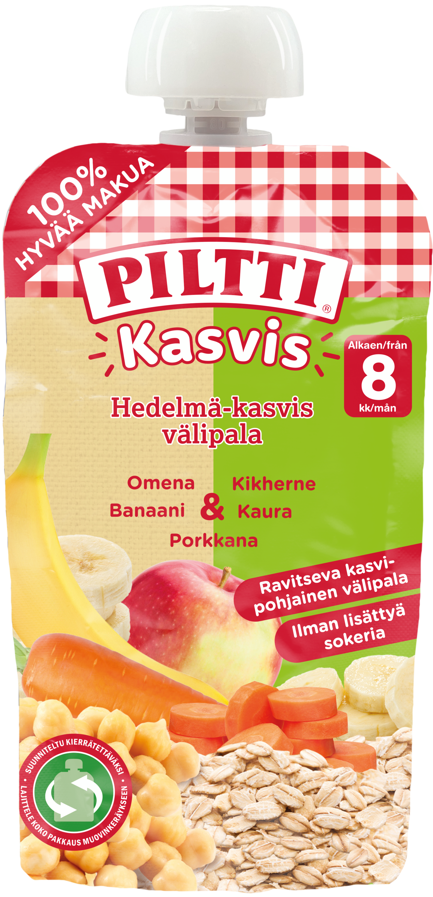 PILTTI Kasvis Hedelmä-kasvis välipala Omena-banaani-porkkana-kikherne-kaura on ravitseva kasvipohjainen välipala vauvallesi 8 kk iästä alkaen. Hedelmiä, kasviksia, kikhernettä ja kauraa sisältävä välipala on helppo ja maistuva tapa lisätä kasviksia lapsesi ruokavalioon, ilman lisättyä sokeria. 100% hyvää makua! Luomuraaka-aineista valmistetuilla PILTTI Hedelmä-kasvis välipaloilla tuot vaihtelua arjen ruokailuun kotona ja reissussa. PILTTI Kasvis tuotesarja on kehitetty lasten eri ikävaiheiden ravinto- ja koostumustarpeisiin sopiviksi, suomalaisten ravitsemussuositusten ja säännösten mukaisesti. Säännöllinen ateriarytmi on tärkeä asia niin meille aikuisille kuin lapsillekin. PILTTI annospussit ovat käteviä välipaloja sekä kotona että reissussa, ja tämä herkullinen välipala sopii mainiosti leikki-ikäisen välipalahetkiin. Tuotekehityksemme on jatkuvaa ja tuotteen koostumusta voidaan muuttaa. Luethan sen vuoksi ainesosaluettelon pakkauksesta aina ennen ruoan tarjoamista.