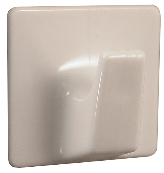 Perinteinen muovinen vaatekoukku vaatteille. Tarrakiinnitys. Väri valkoinen, 35 x 35 mm. Kolme kappaletta paketissa.